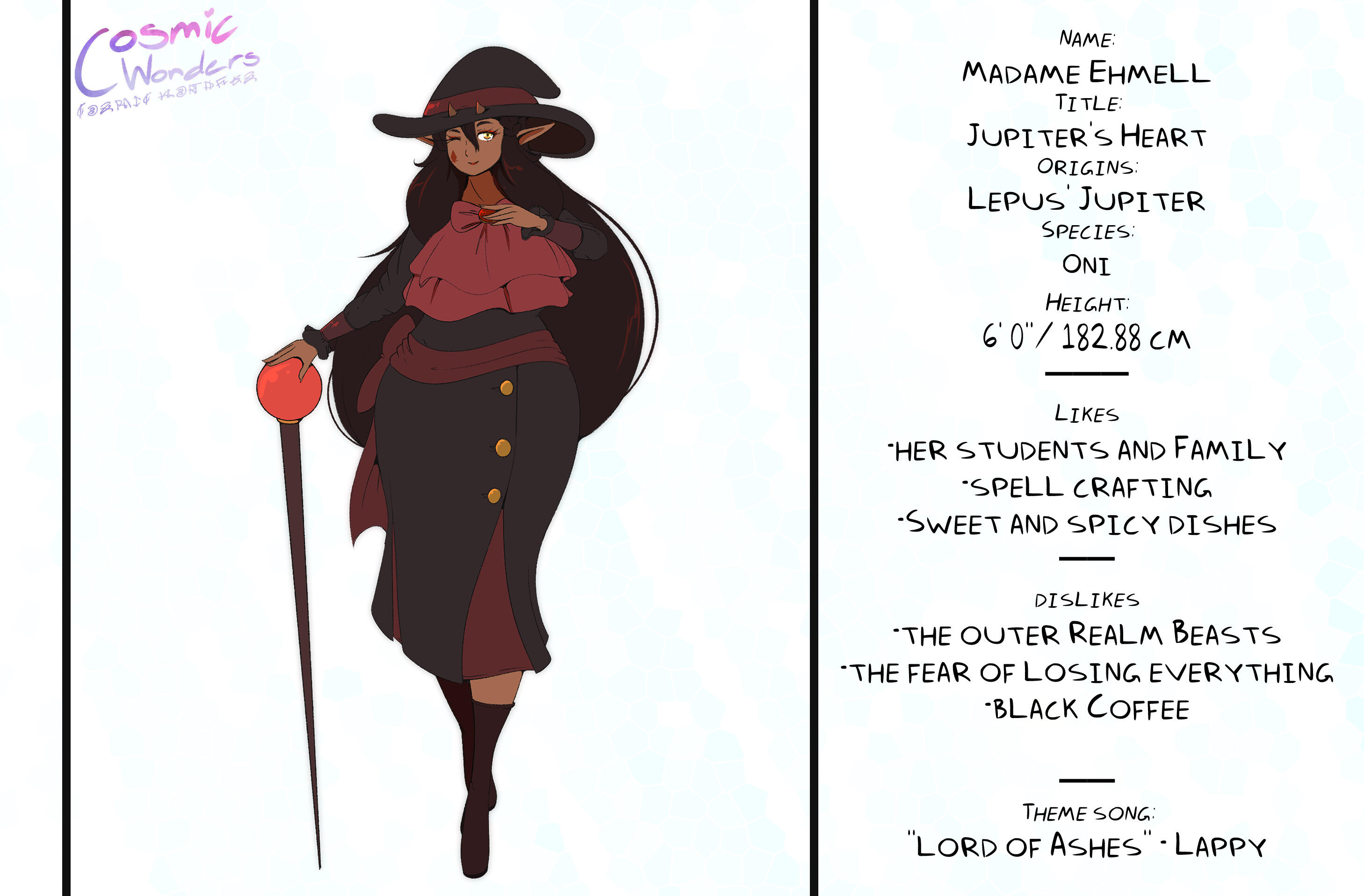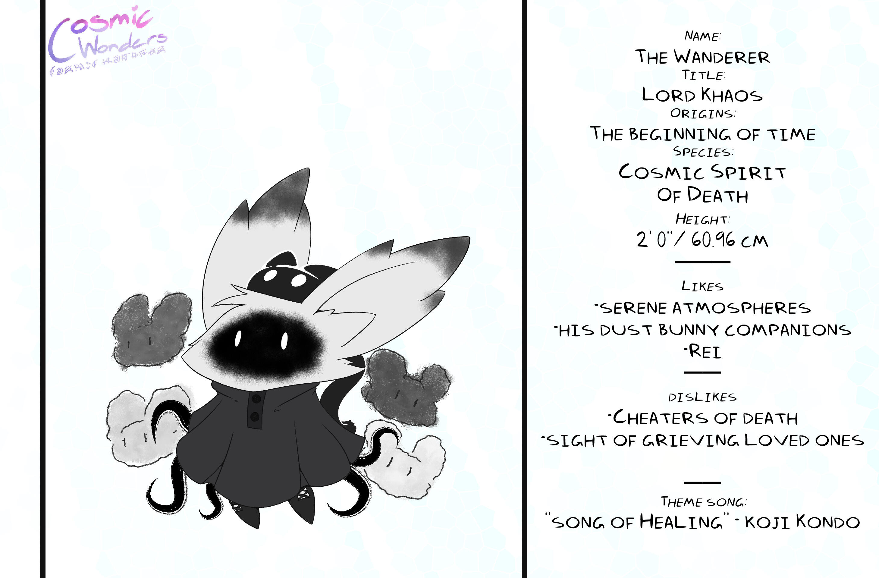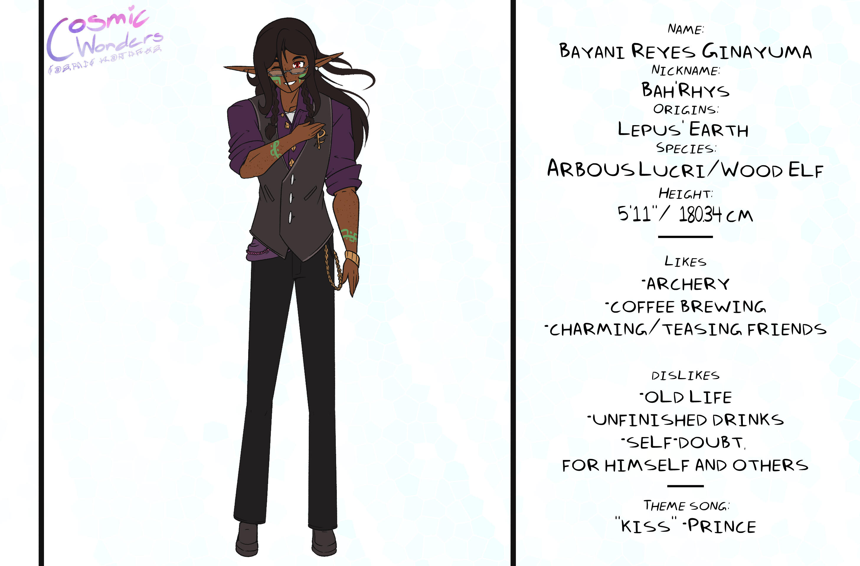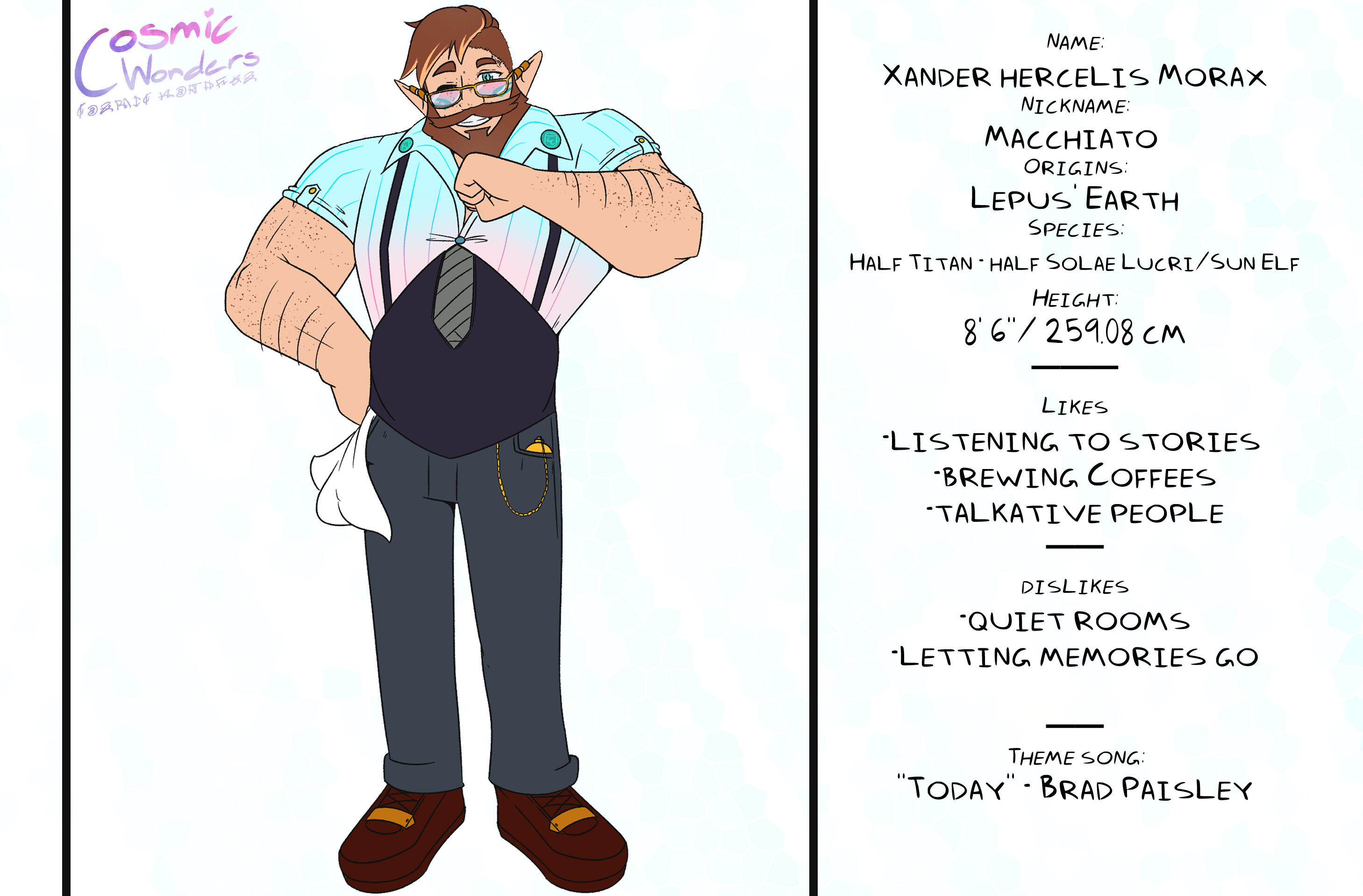 Inspired by Greek Mythology, Shintoism, Chinese Zodiac, and Japanese Manga,Set in an Alternative Reality based on the 12 Animals of the Zodiac, Cosmic Wonders takes place in the Rabbit, Lepus, Plane of said universe. Deep in the heart of that plane is a coffee shop called Cafe Cosmos, run by a giant of a man named Macchiato, who greets customers, mortal and immortal alike, and listens to their stories of the cosmos they live in.A compilation of short stories that explore coming of age, grief, finding yourself, love, many social topics and mental struggles told through the eyes of the characters.